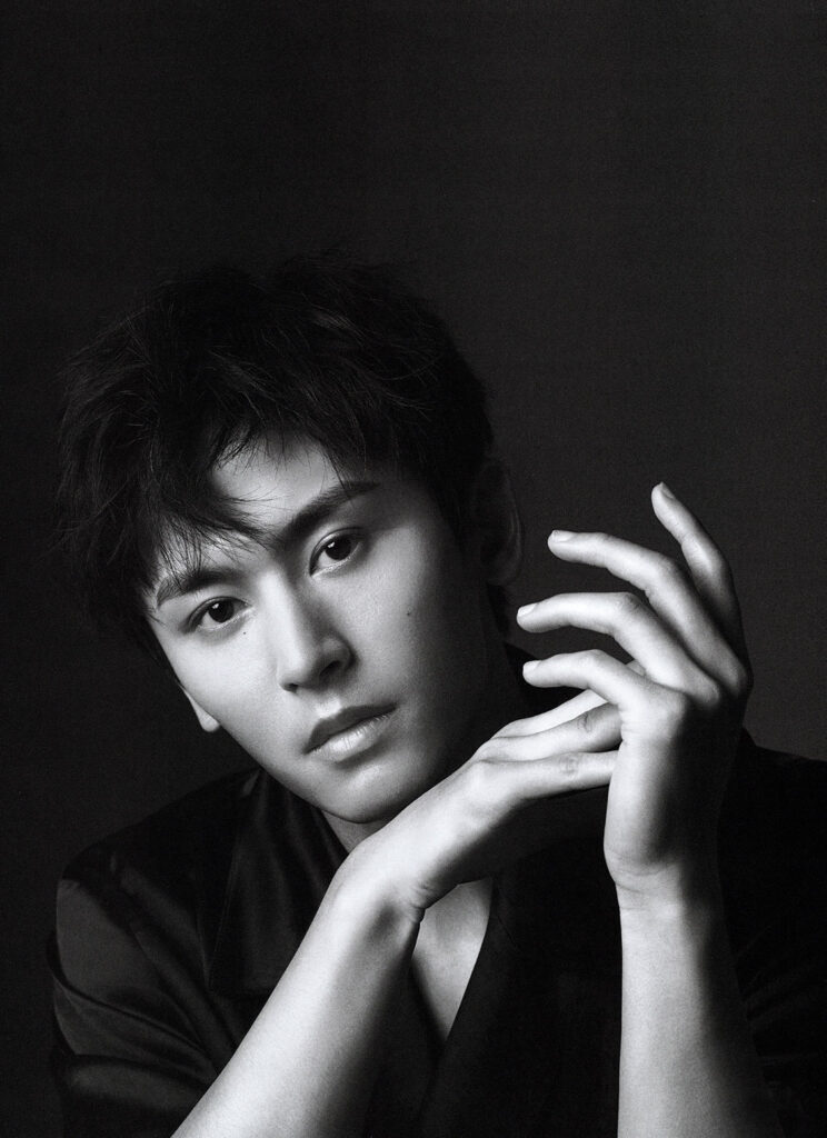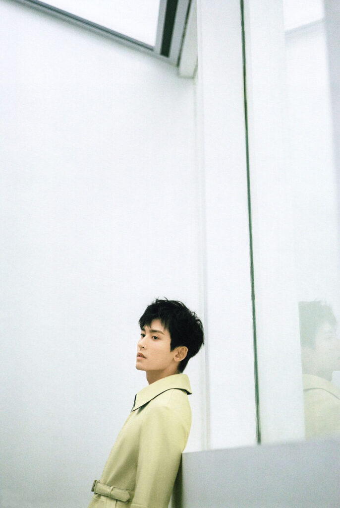 身形整體偏瘦,精神氣十足,透露出力量感。拍攝前, 他昂首挺胸,端正地坐在椅子上聆聽攝影師與團隊交流; 拍攝開始,很快進入狀態,面容平和,用眼神傳遞故事情緒。一切和他在劇中給人的印象十分契合。