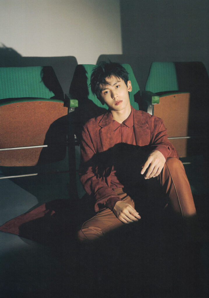 現在,他非常平和,還時常在工作中突發奇想,進行自我創作。這一次拍攝時,影棚被布置成電影院的樣子,身穿橘紅長款風衣的張哲瀚躺在地上思考怎樣拍得更好看,突然懇切地向片場一位與自己身形相似的攝影師提出換上他的衣服的請求。原來他是想讓自己躺在另一個自己的身旁,表達兩個“我”進行對話的意境,盡管這個巧妙的方案因為時間問題沒有實現。