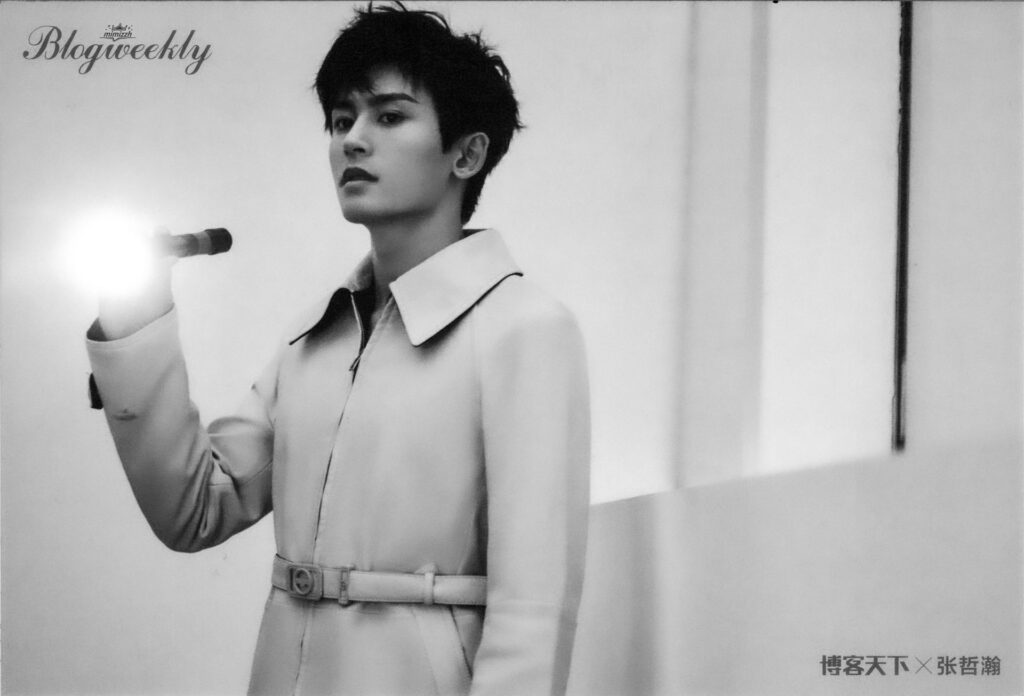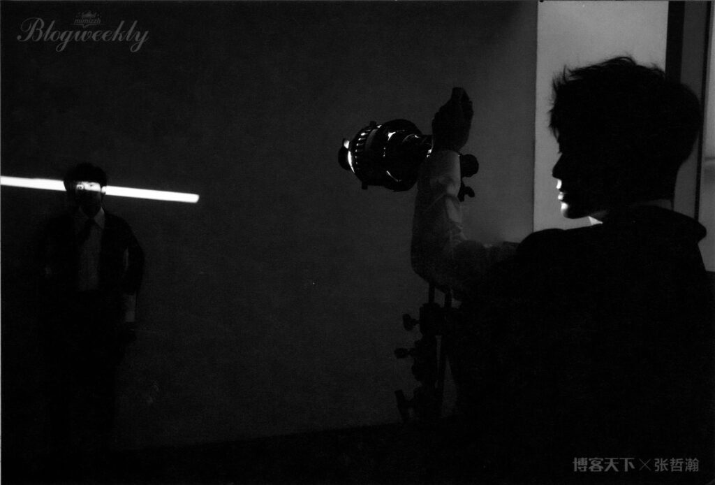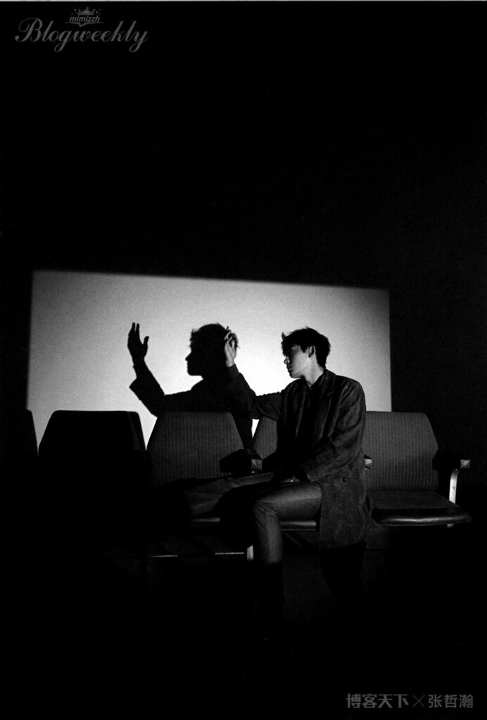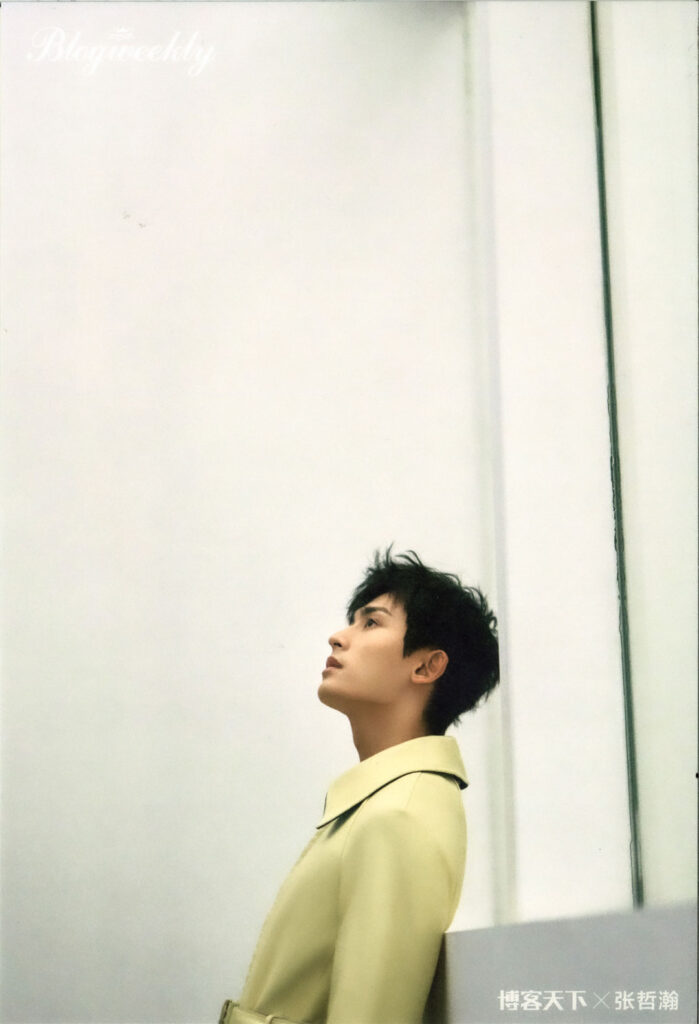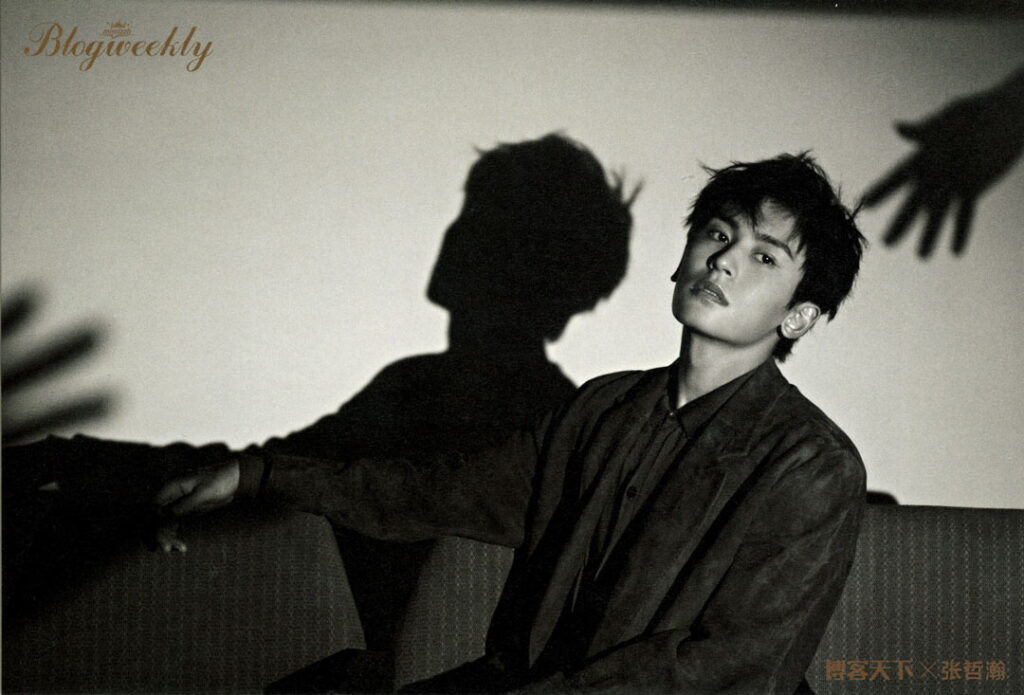 這次在上海接受《博客天下》采訪和拍攝時,張哲瀚會主動檢查拍好的成片,並與攝影師溝通,提出自己的看法,調整表情、臉部朝向、手的擺放位置等細節。在一組借助投影燈光做成的“我還是我”構圖中,起初因為字間距緊湊,字體投到脖子上顯得人像有些模糊,效果不太好, 張哲瀚隨即提出可以讓字多空一格。經過調整後,投影與人像很好地融在了一起。